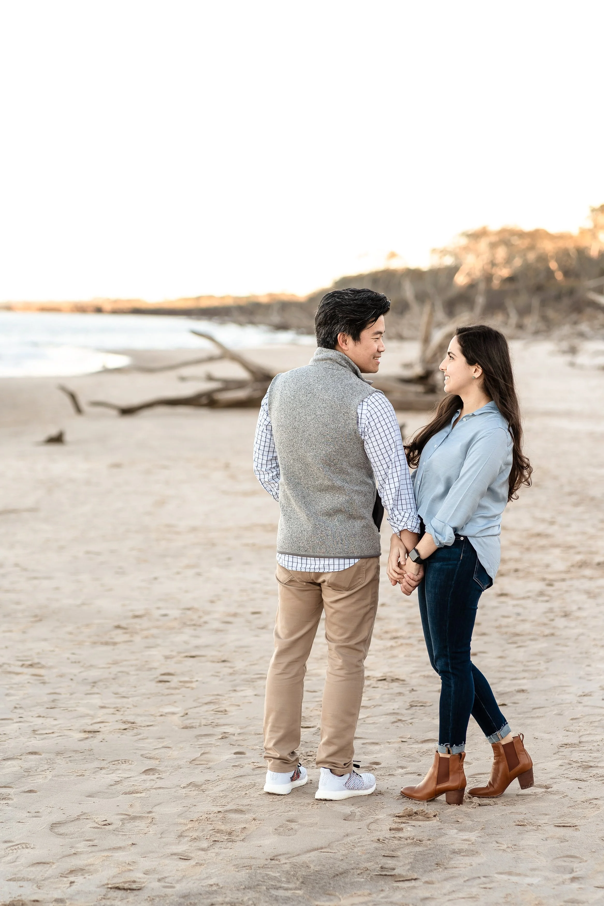 A couple holding hands and smiling at each other on a sandy beach near the water at sunset.