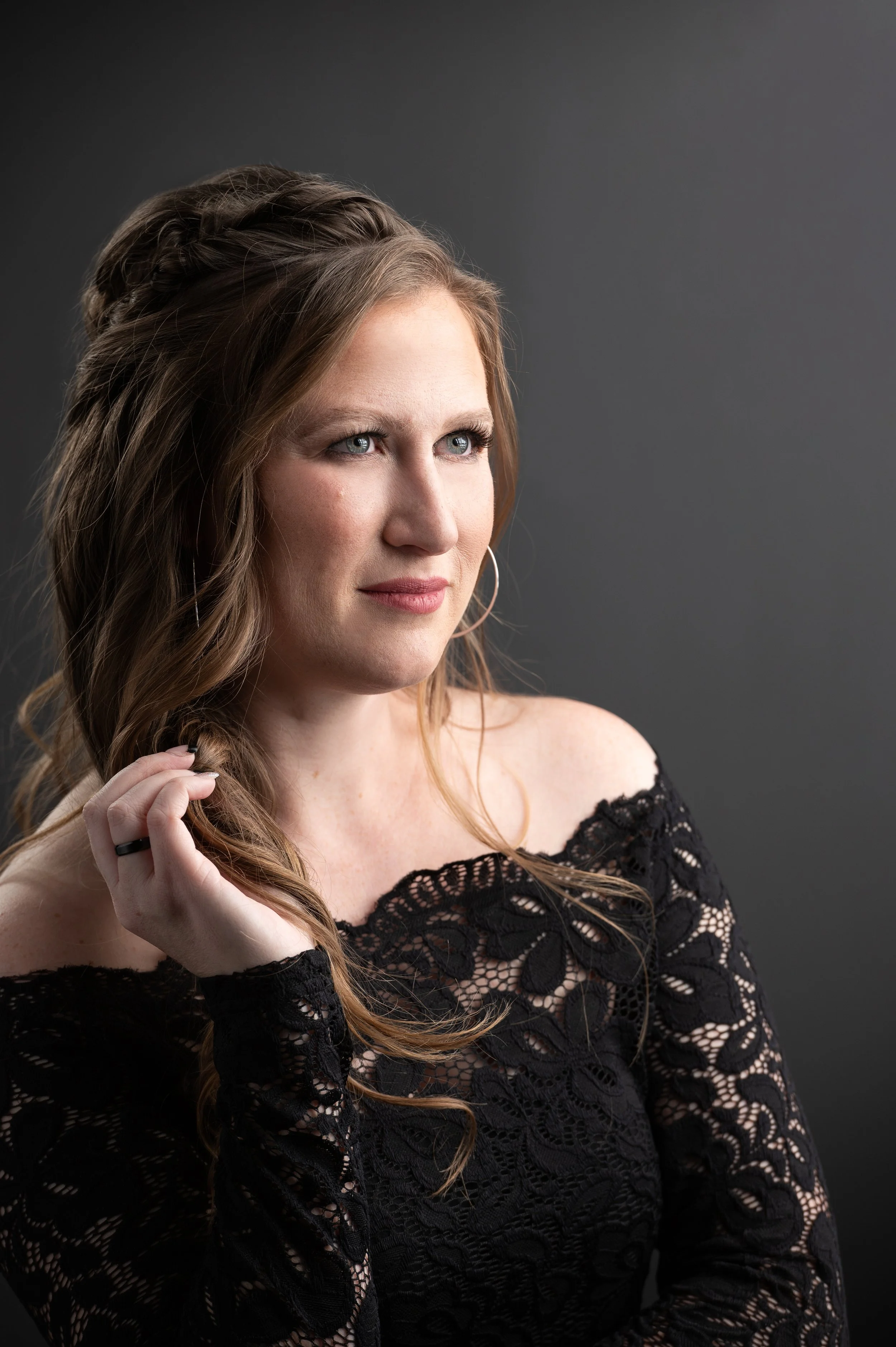 A woman with long, wavy red hair, wearing a black lace off-shoulder top, and large hoop earrings, looking thoughtfully to the side against a dark grey background.