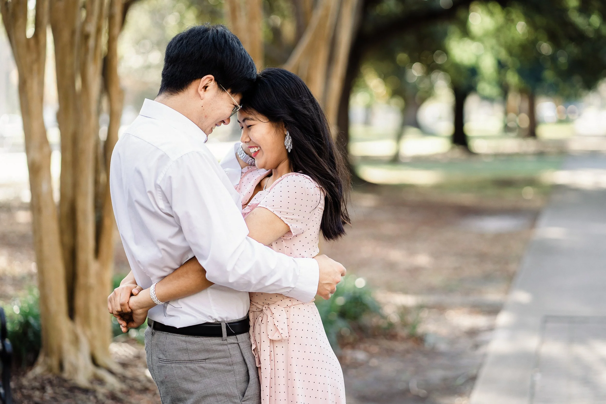 A happy couple sharing a close moment outdoors in a park, with trees and a sidewalk in the background.