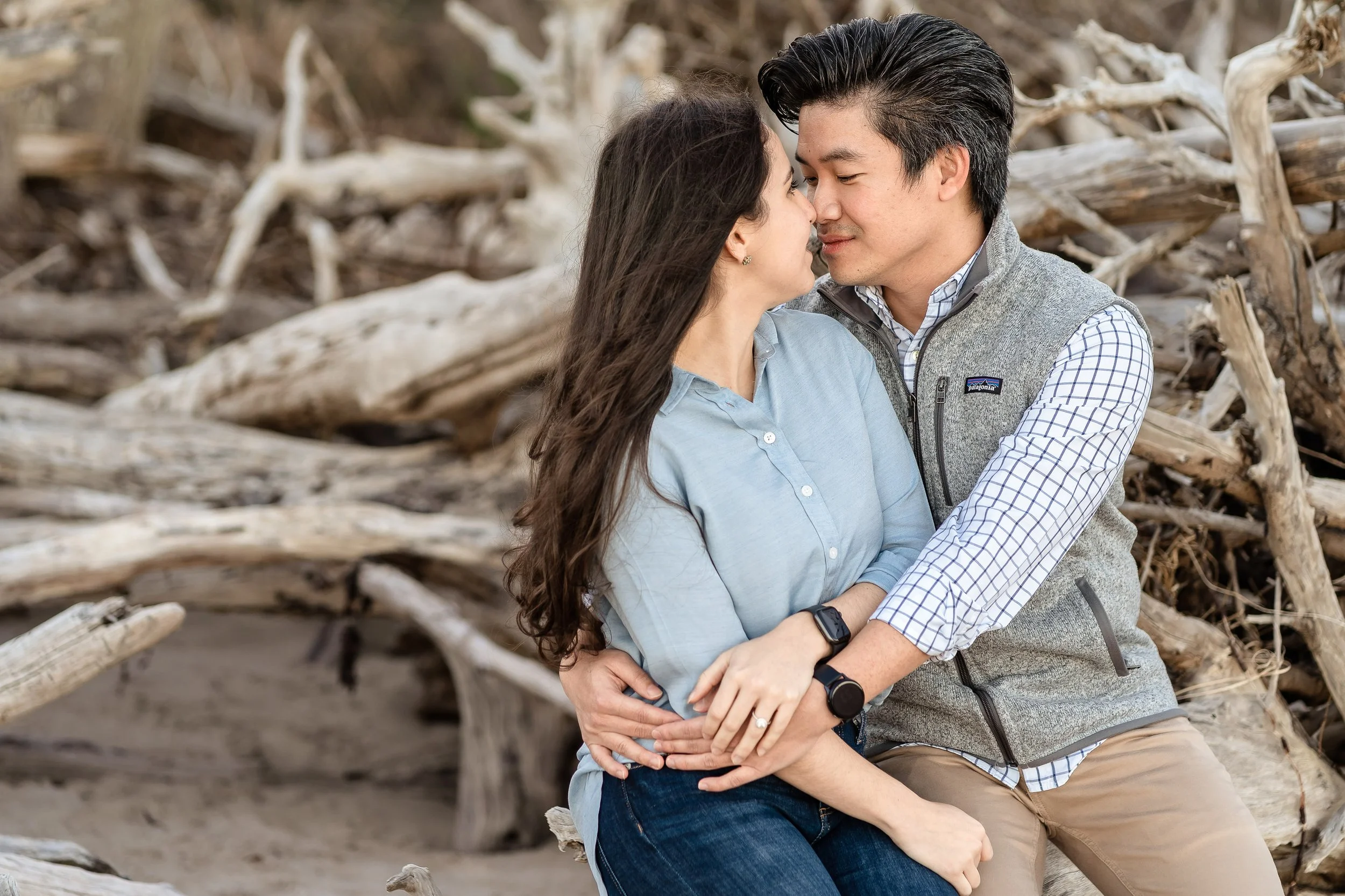 A couple sitting close together outdoors, embracing and about to kiss, with driftwood in the background.